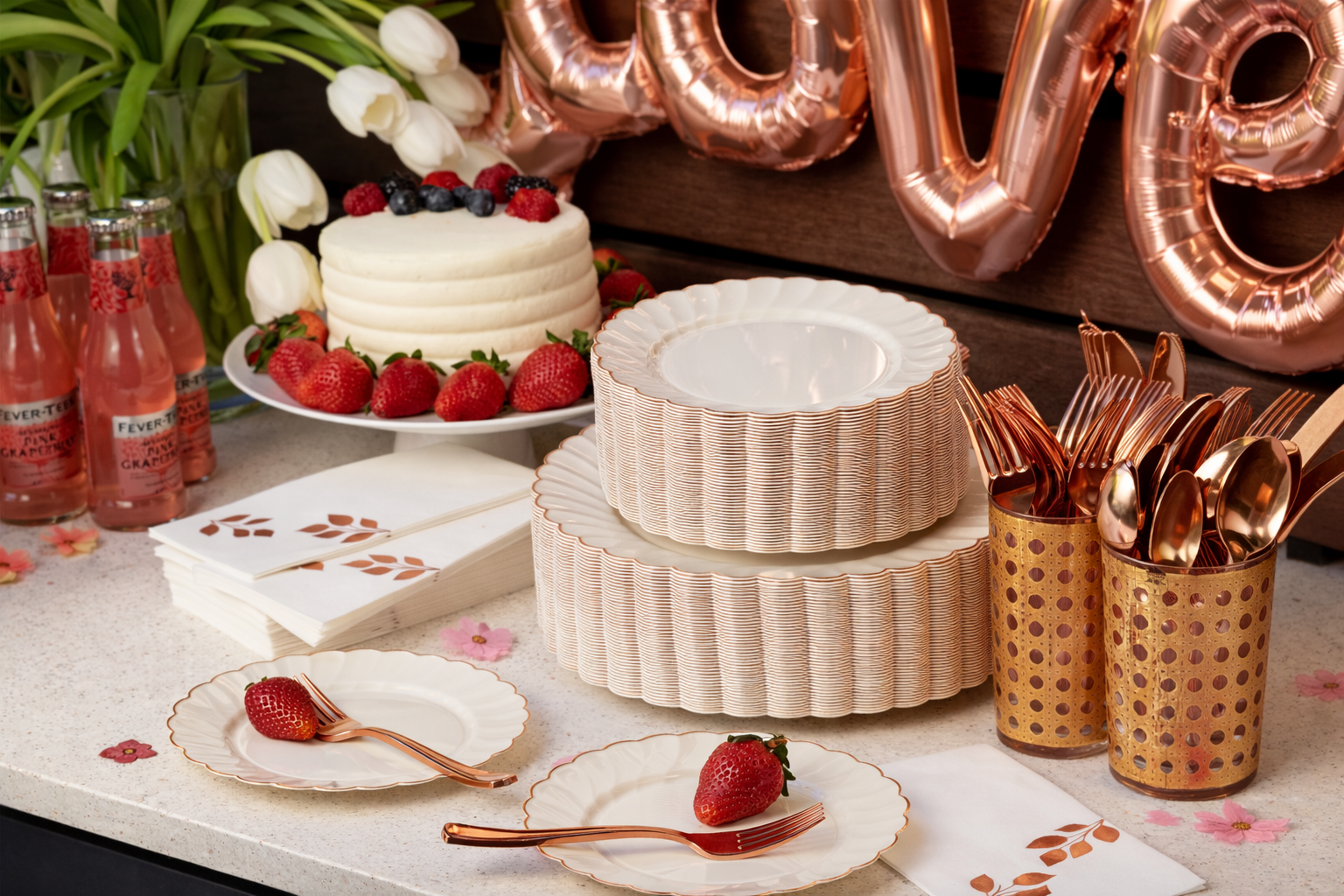 By Madee HEAVYWEIGHT Fancy Disposable Dinnerware Set – 175-Piece Ivory and Scalloped Rose Gold Disposable Plates, Cutlery & Linen-Feel Napkins, Elegant Nice for Weddings & Party (25 Guests)