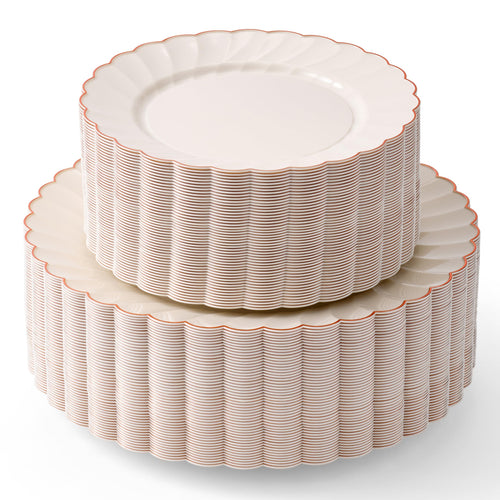 By Madee HEAVYWEIGHT 100 Pc Fancy Disposable Plates Set | Ivory Scalloped Premium Disposable Plates with Rose Gold Trim | 50 Dinner Plates & 50 Dessert Wedding Shower Party